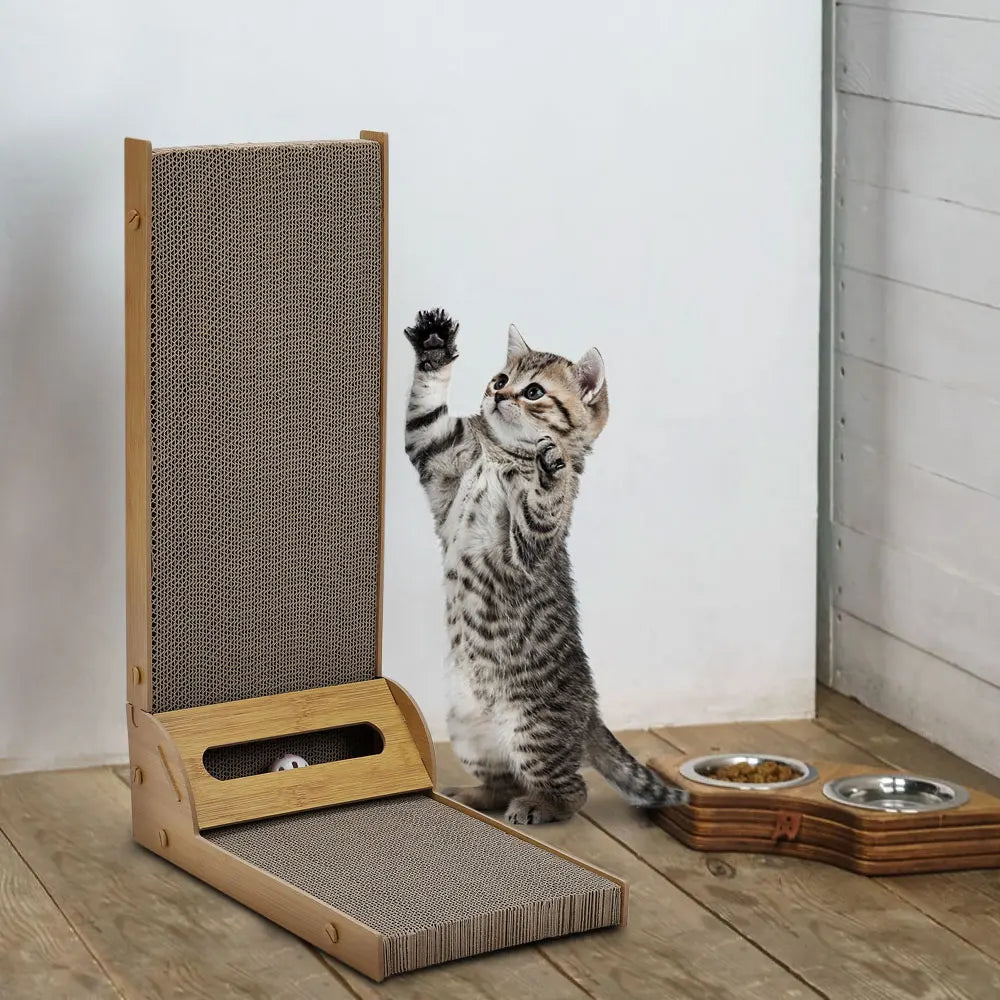 Crafted from high-density corrugated paper, this sturdy L-shaped design provides multiple angles for your cat to sharpen claws, relieve stress, and stay active. The built-in bell toy adds an extra layer of fun, turning every scratch session into a playful adventure.